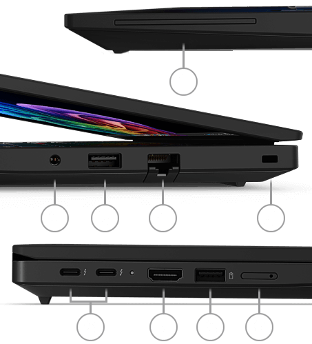 2x Thunderbolt™ 4 (40GBit/s, DisplayPort™ 2.1, Power Delivery 3.0), *Ein Anschluss ist belegt, wenn Gerät über Type-C Netzteil geladen wird! |