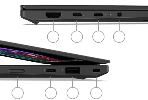 3x Thunderbolt™ 4 (40GBit/s, DisplayPort™ 1.4, Power Delivery 3.0), *Ein Anschluss ist belegt, wenn Gerät über Type-C Netzteil geladen wird! |