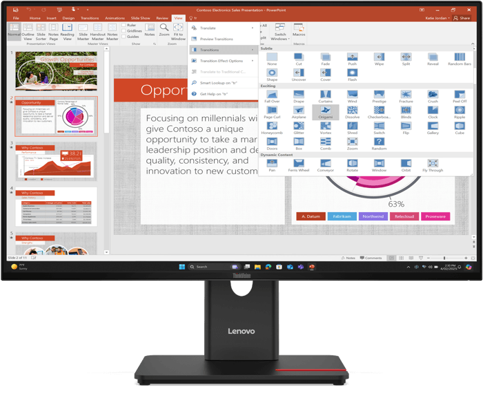 Der ThinkVision T27-40 (27") ist für moderne Arbeitsumgebungen konzipiert. Mit Full-HD-Auflösung, einer variablen Bildwiederholrate von bis zu 120 Hz und einem hohen Kontrastverhältnis von 1500:1 bietet er eine flüssige und scharfe Darstellung. Die Konnektivität wird durch HDMI 1.4, DisplayPort 1.2, VGA sowie einen USB-Hub mit vier Downstream-Ports (einschließlich 1 x USB-C mit 15W PD für Daten) sichergestellt. Das 4-seitige ultra-schmale Design ermöglicht zudem eine nahezu nahtlose Multi-Monitor-Nutzung.